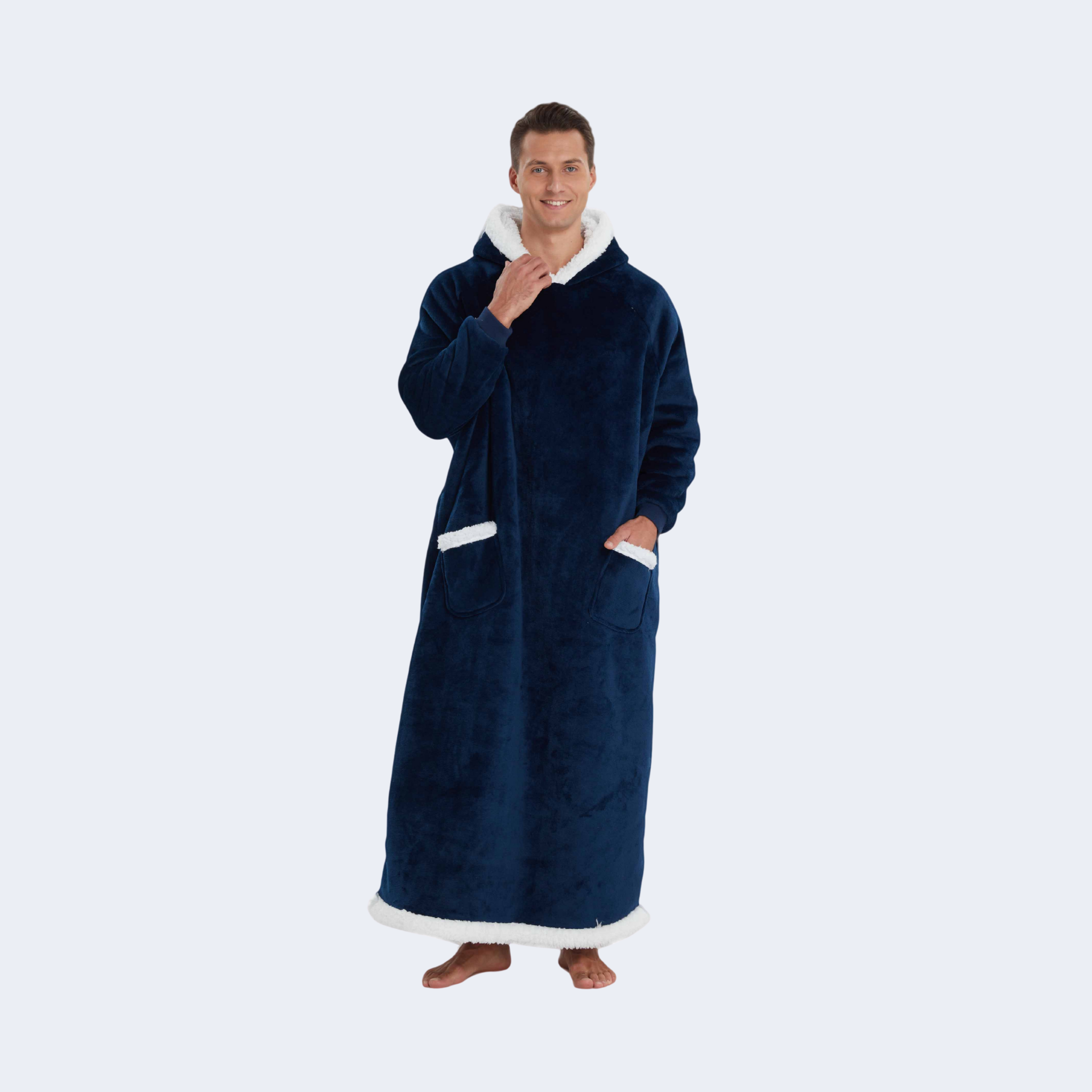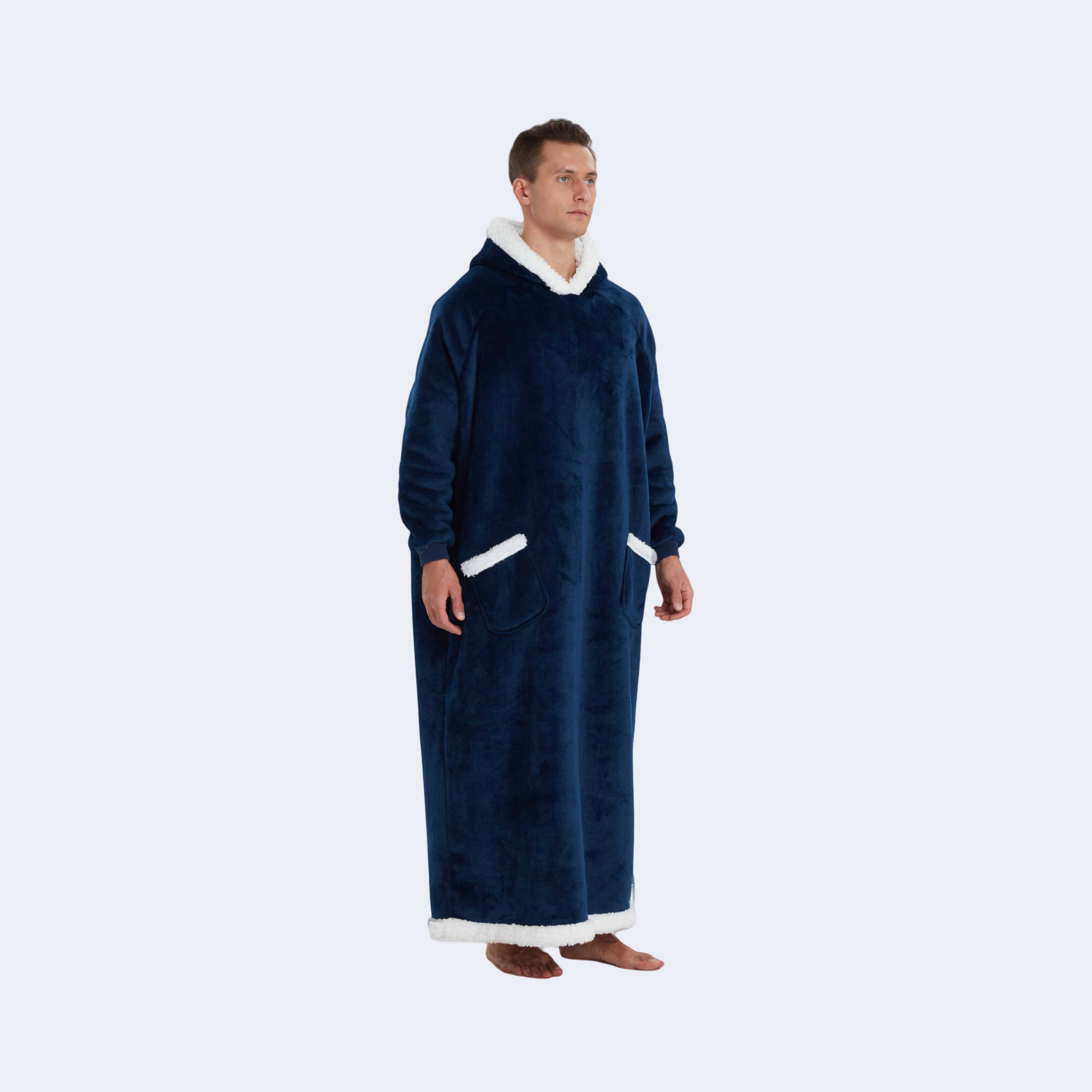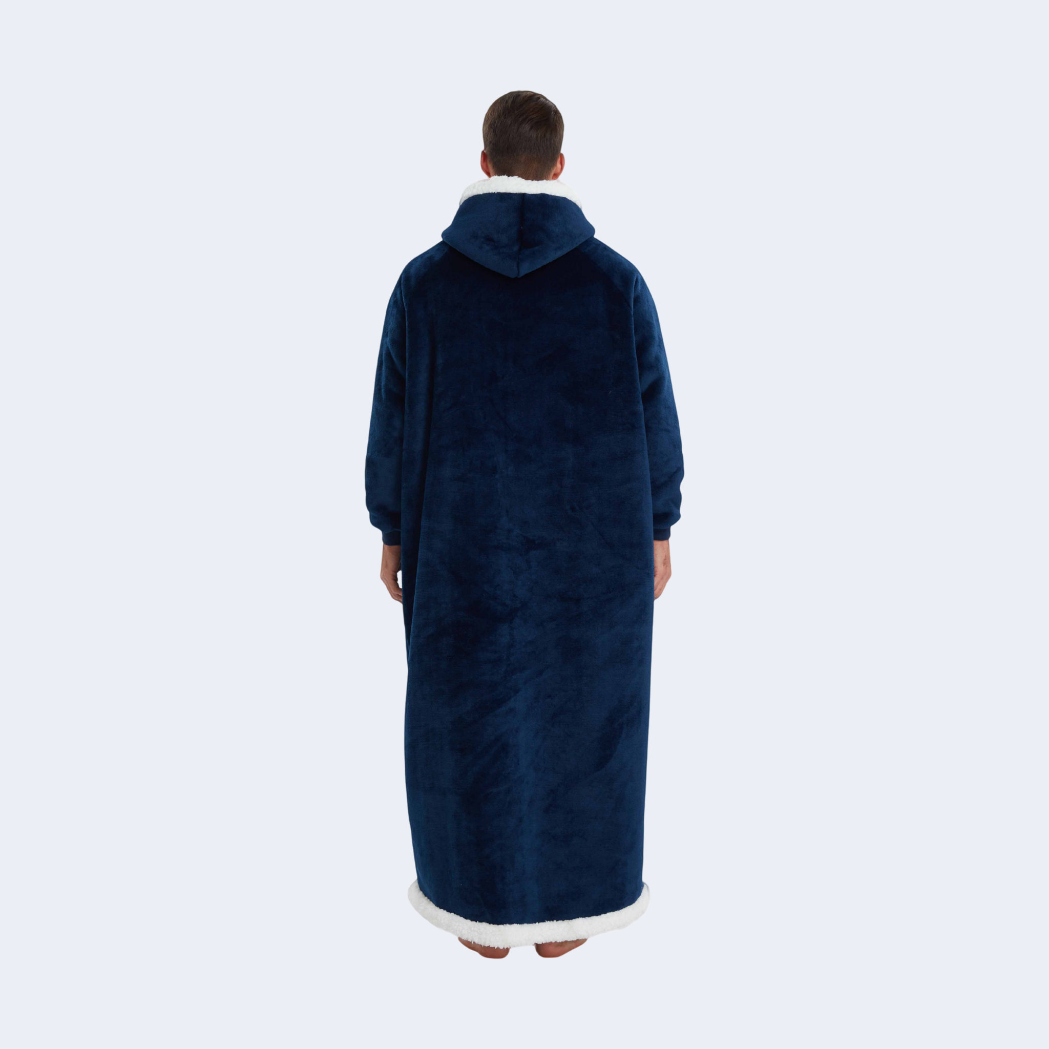 The Navy Full-Length Haven is an oversized full-length hoodie blanket designed for clean, timeless comfort. Deep navy fleece on the outside and plush sherpa inside create refined, everyday warmth β crafted in small batches for lasting quality. π