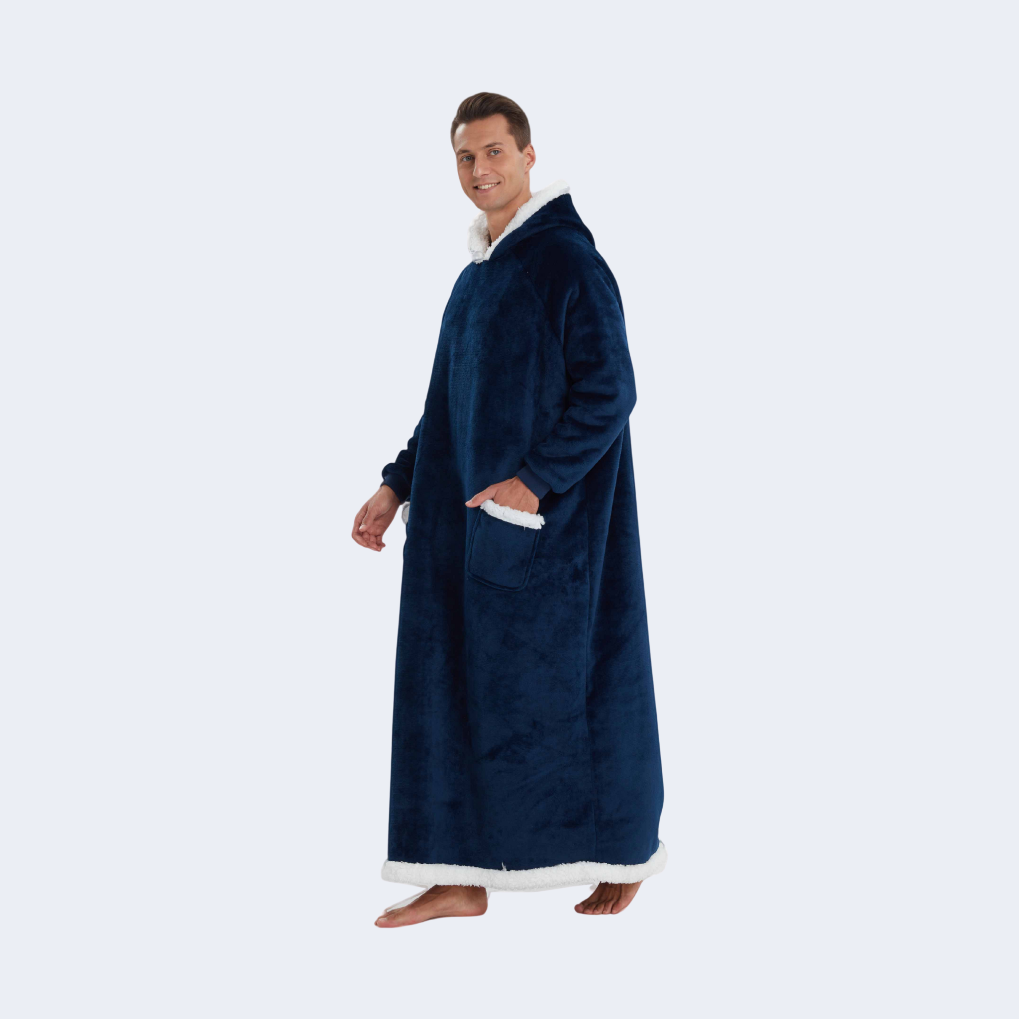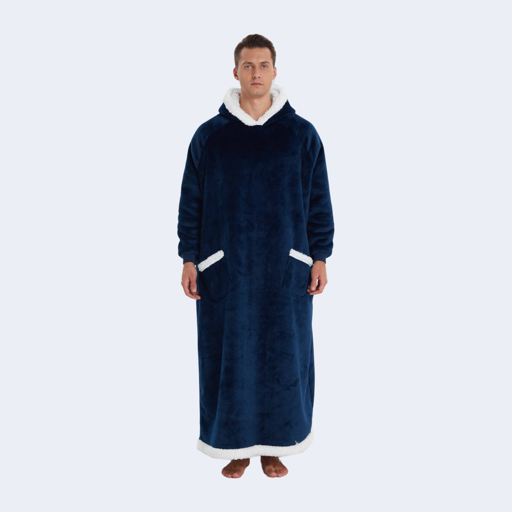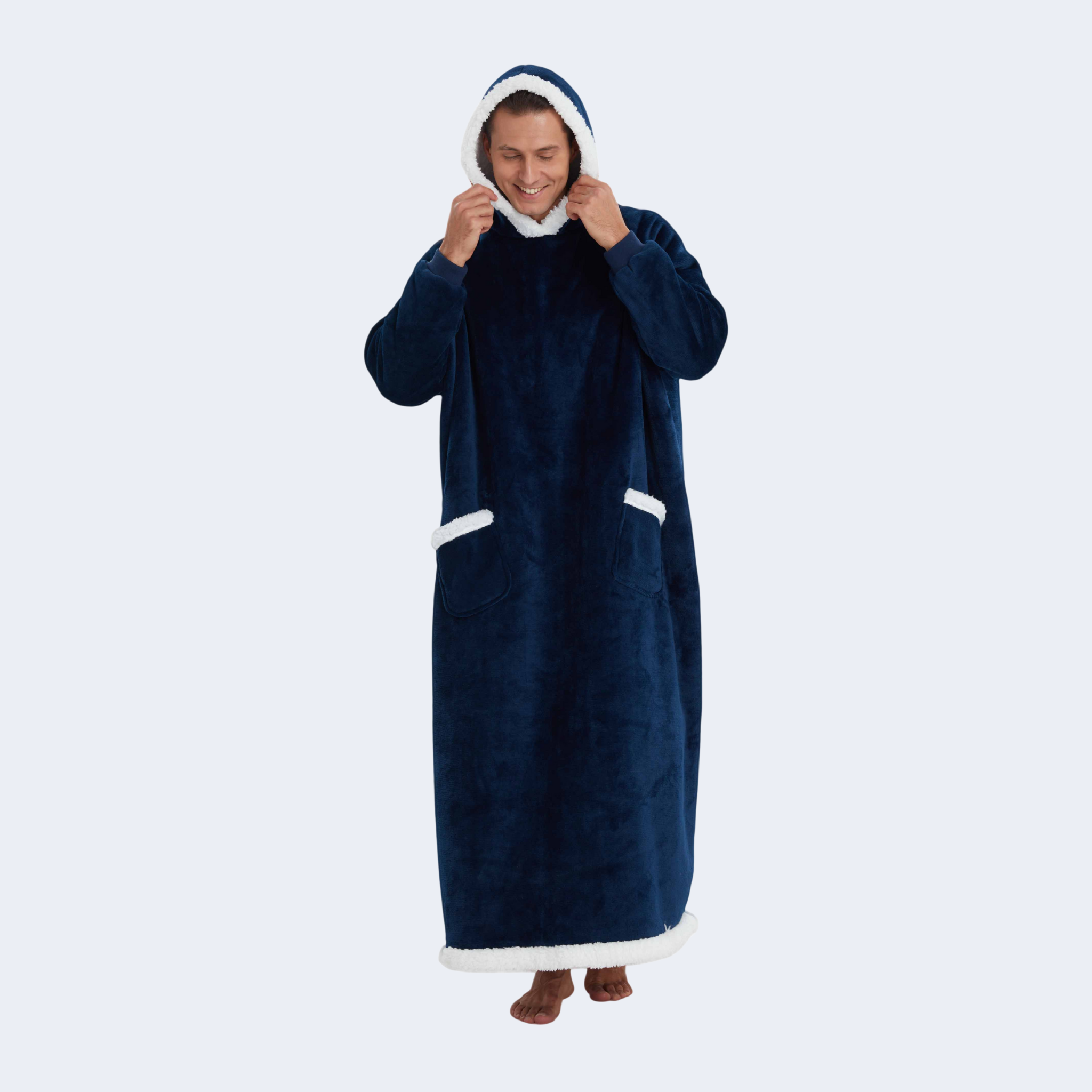 The Navy Full-Length Haven is an oversized full-length hoodie blanket designed for clean, timeless comfort. Deep navy fleece on the outside and plush sherpa inside create refined, everyday warmth β crafted in small batches for lasting quality. π